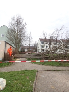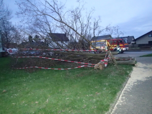Durch die letzten windigen Tage, drohte nun ein größerer Baum auf einen Gehweg zufallen. Vor Ort stand ein Baum an einem Gehweg schon schräg und der Wurzelteller bewegte sich schon massiv bei jeder Windböe. Um ein unkontrolliertes Umstürzen zu verhindern, musste der Baum durch die Feuerwehr gefällt werden. Eine Fachfirma und der Eigentümer konnten durch die Polizei nicht erreicht werden. Nach der Fällung wurde die Zuwegung freigeschnitten und der Baumreste mit Flatterband gesichert.