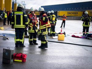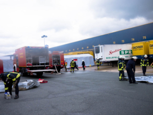 Auf einer Wechselbrücke, die an einer Verladerampe stand, ist eine nicht zu definierende Flüssigkeit ausgelaufen, von der eine unbekannte Gefahr ausging. Der Fokus der ersteintreffenden Kräfte beschränkte sich auf das Retten von Verletzten, das Absperren des Gefahrenbereichs sowie das Aufbauen der Notdekon. Die Notdekon wird eingesetzt, um die Einsatzkräfte, Verletzten und Geräte von schadhaften Stoffen grob zu reinigen. In Summe mussten sechs Verletzte versorgt werden. Der Gefahrenbereich wurde abgesperrt und gekennzeichnet.