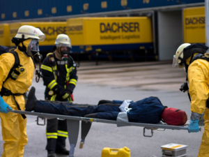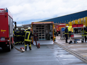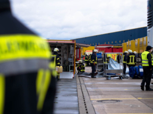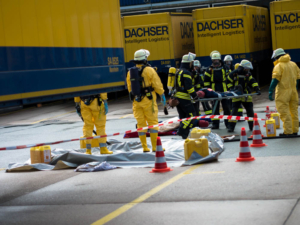Auf einer Wechselbrücke, die an einer Verladerampe stand, ist eine nicht zu definierende Flüssigkeit ausgelaufen, von der eine unbekannte Gefahr ausging. Der Fokus der ersteintreffenden Kräfte beschränkte sich auf das Retten von Verletzten, das Absperren des Gefahrenbereichs sowie das Aufbauen der Notdekon. Die Notdekon wird eingesetzt, um die Einsatzkräfte, Verletzten und Geräte von schadhaften Stoffen grob zu reinigen. In Summe mussten sechs Verletzte versorgt werden. Der Gefahrenbereich wurde abgesperrt und gekennzeichnet.