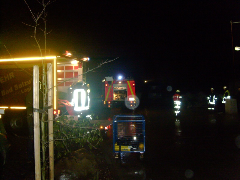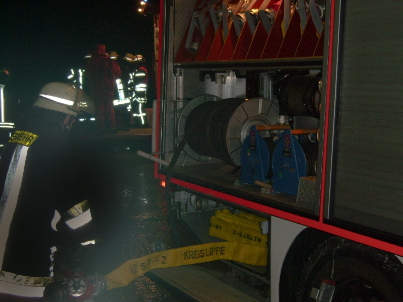 Zeitgleich erreichten der Gerätewagen Logistik aus Lockhausen und das Löschgruppenfahrzeug LF 10/6 aus Wülfer die Einsatzstelle. Die TLF- Besatzung errichtete eine Notdekon aus Steckleiterteilen und Folie. Es wurden die Ein- und Ausgänge markiert und die Einsatzstelle abgesperrt. Die Kameraden bauten einen dreifachen Löschangriff auf, bestehend aus den Löschmitteln Wasser, Schaummittel sowie einem Pulverlöscher.