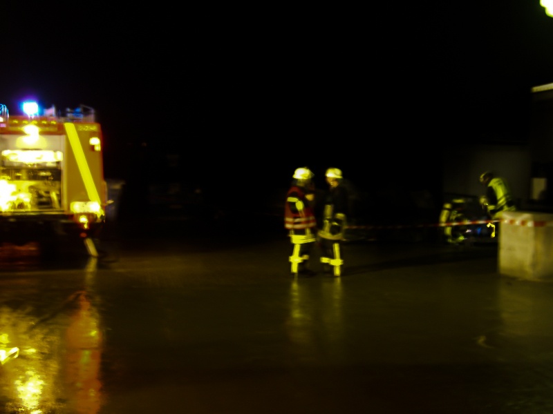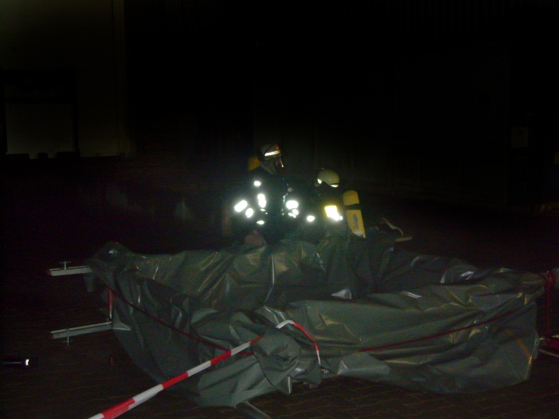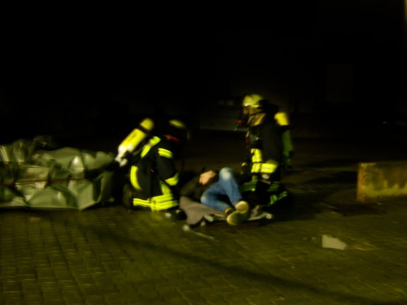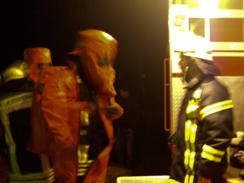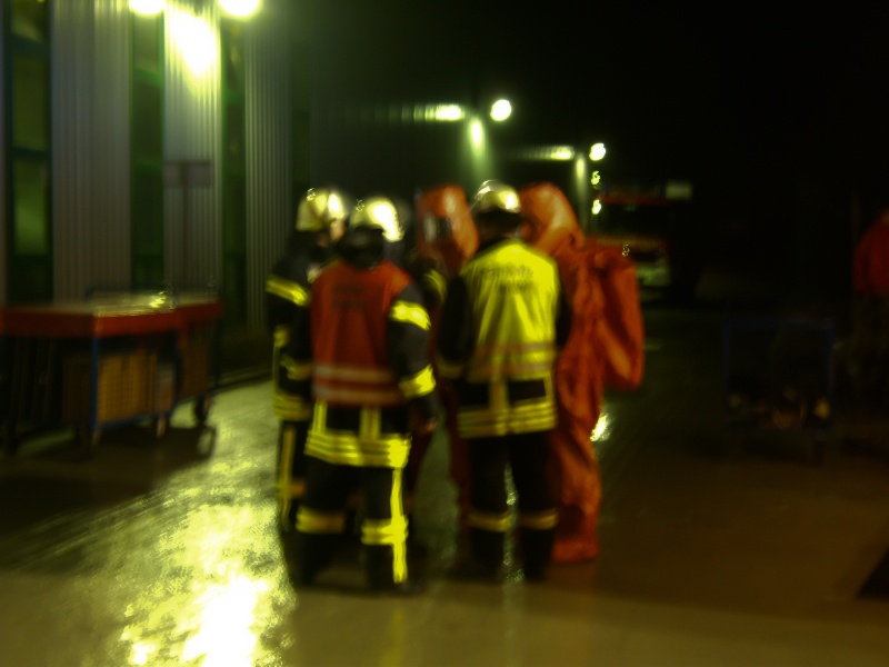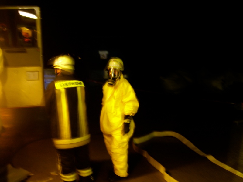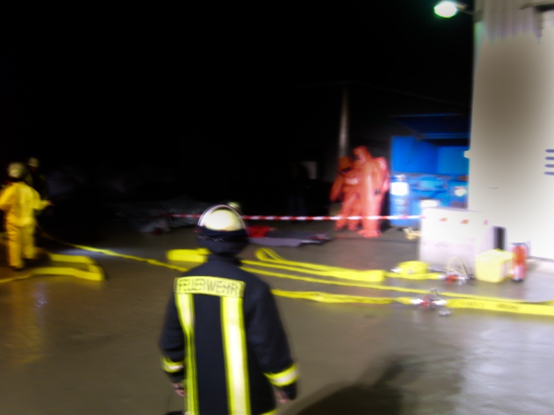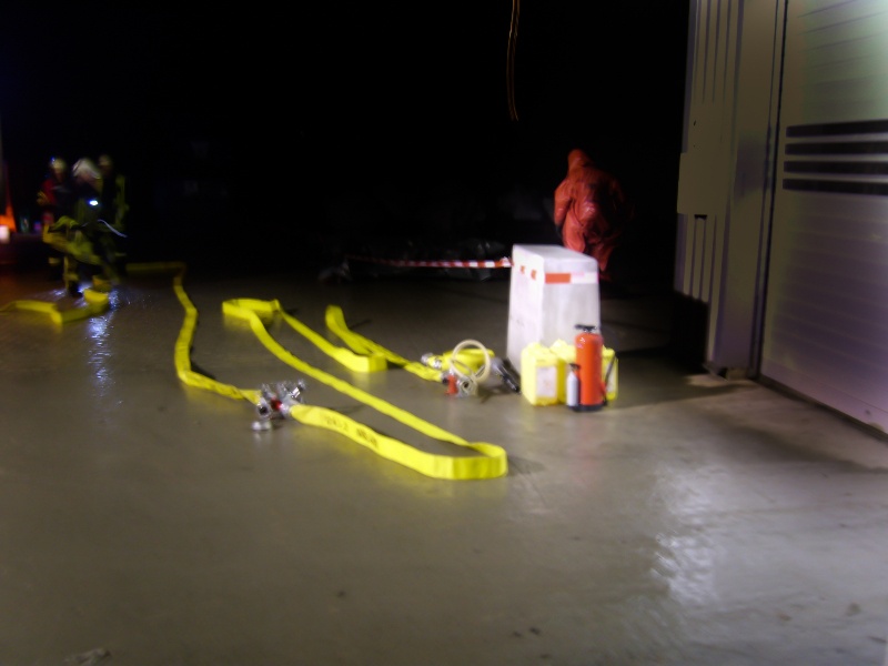 Die erste vermisste Person wurde nach kurzer Zeit in einem Stapler vorgefunden. Der Gabelstaplerfahrer hatte bei Rangierarbeiten einen Gefahrgutbehälter beschädigt, aus dem eine unbekannte Flüssigkeit auslief. Während der Rettungsmaßnahmen entdeckte der erste Angriffstrupp den beschädigten Gefahrgutbehälter und gab die UN- Nummer an den Einsatzleiter weiter. Somit konnte auf schnellstem Wege der Gefahrstoff Propionsäureanhydrid (Gefahrenklasse 8 ) mit der UN- Nummer 2496 ermittelt werden. Aufgrund dieser Informationen wurden nun weitere Einsatzkräfte mit CSA (Chemikalienschutzanzug) zur Menschenrettung eingesetzt. Der zweite Angriffstrupp des TLF dekontaminierte die Verletzten und die CSA- Träger. Einweganzüge sowie Masken mit Filtergerät dienten dabei zum Eigenschutz.