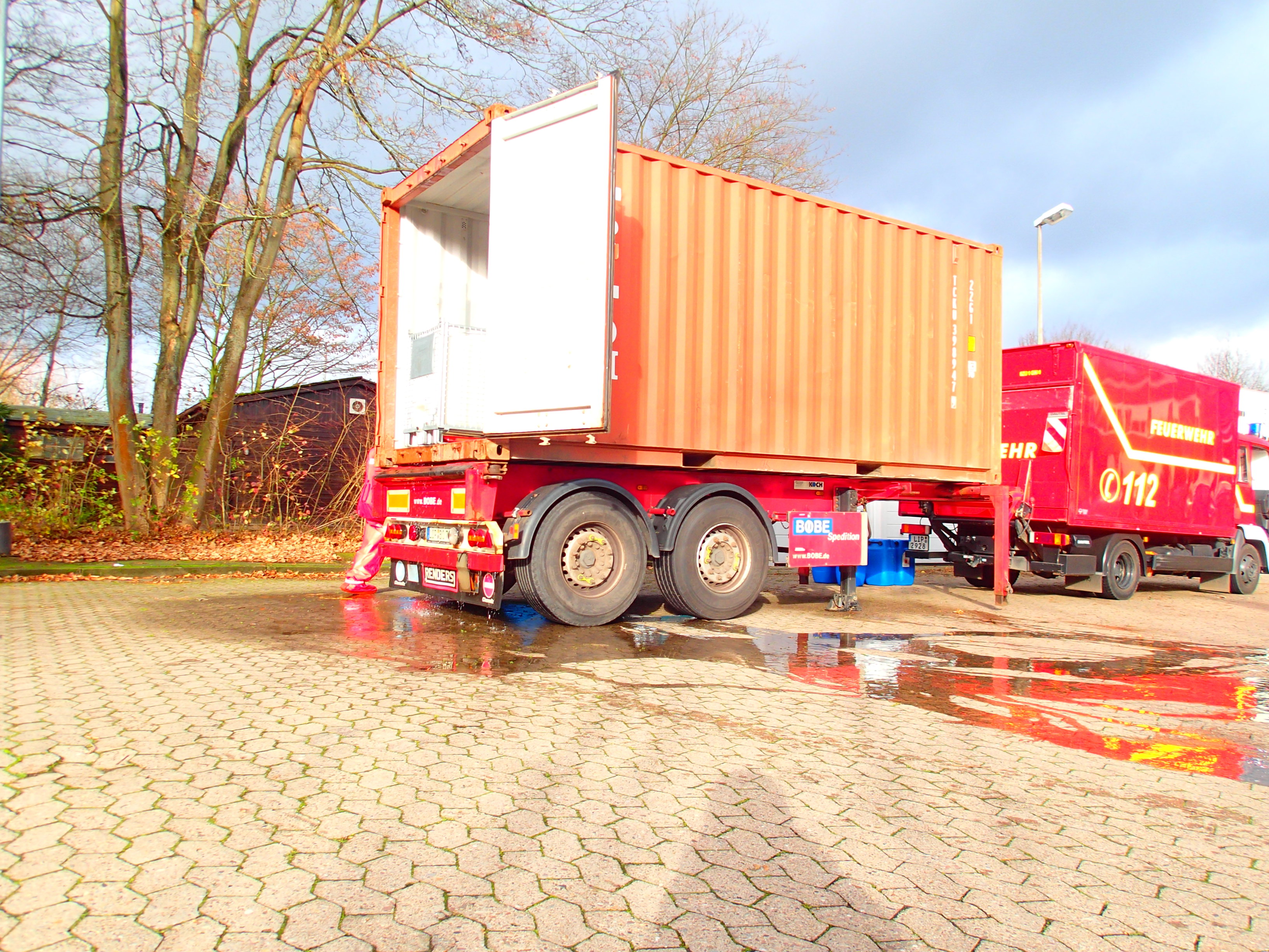 Ein besonderer Dank geht an die Spedition BOBE, die uns zum Üben einen 20 Fuß ISO- Container zu Verfügung gestellt hat. Hierdurch lassen sich die Übungen relalitätsnah durchführen und auch die jüngeren Kollegen bekommen Einblicke in die Besonderheiten dieses Transportmedium.