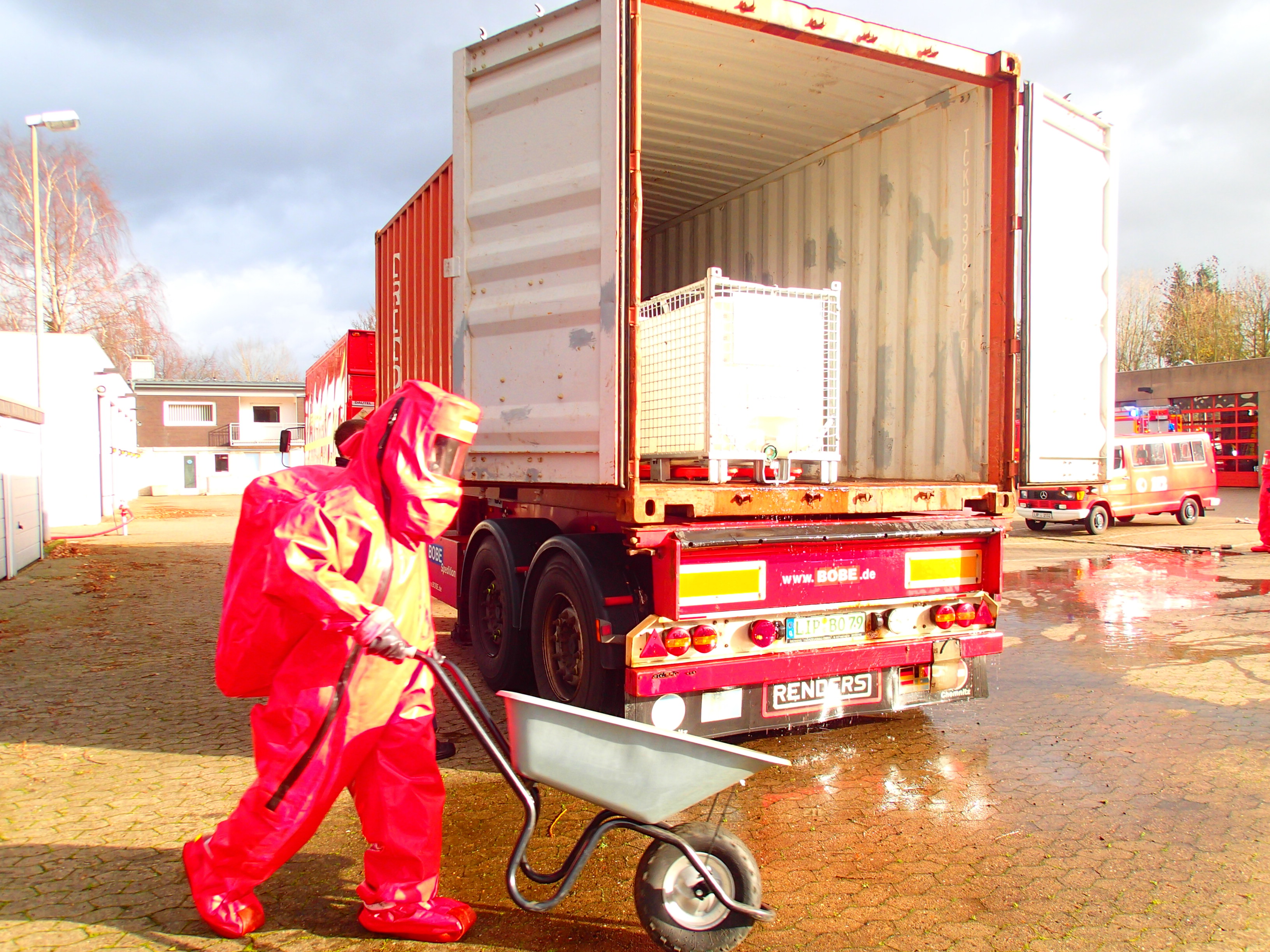 Nach der Mittagspause wurde es allerdings ernst. Die Ladung eines Überseecontainers war beim Beladen bei der Spedition leckgeschlagen. Flüssigkeit tropfte aus dem Container und es stieg eine große Rauchwolke auf. Der Gruppenführer stellte wärend seiner Erkundung fest, dass in dem Container noch zwei Personen vermisst werden. Der Angriffstrupp, der sich zu diesem Zeitpunkt bereits mit CSA ausgerüstet hatte, ging sofort zur Menschenrettung vor. Parallel hierzu wurde ein Dekontaminationsplatz aufgebaut. Hier müssen die Verletzten vor der Übergabe an den Rettungsdienst zuerst von den Schadstoffen an Kleidung und Haut befreit werden. Nachdem die Menschenrettung durchgeführt war, musste nun das Leck am Behälter geschlossen werden. Ein weiterer Trupp unter CSA verhinderte die Ausbreitung der giftigen Flüssigkeit in die Kanalisation durch das setzen eines Dichtkissens.