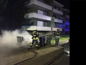 Im Maiweg brannten auf einer Fläche von ca. 10m² gelbe Säcke und mehrere Mülltonnen. Das Feuer wurde mit den Schnellangriffseinrichtungen des HLF20 und des HTLF4000 bekämpft. Auslöser waren vermutlich Feuerwerkskörper zwischen den Säcken. Anwohner hatten im Vorfeld Knallgeräusche war genommen.