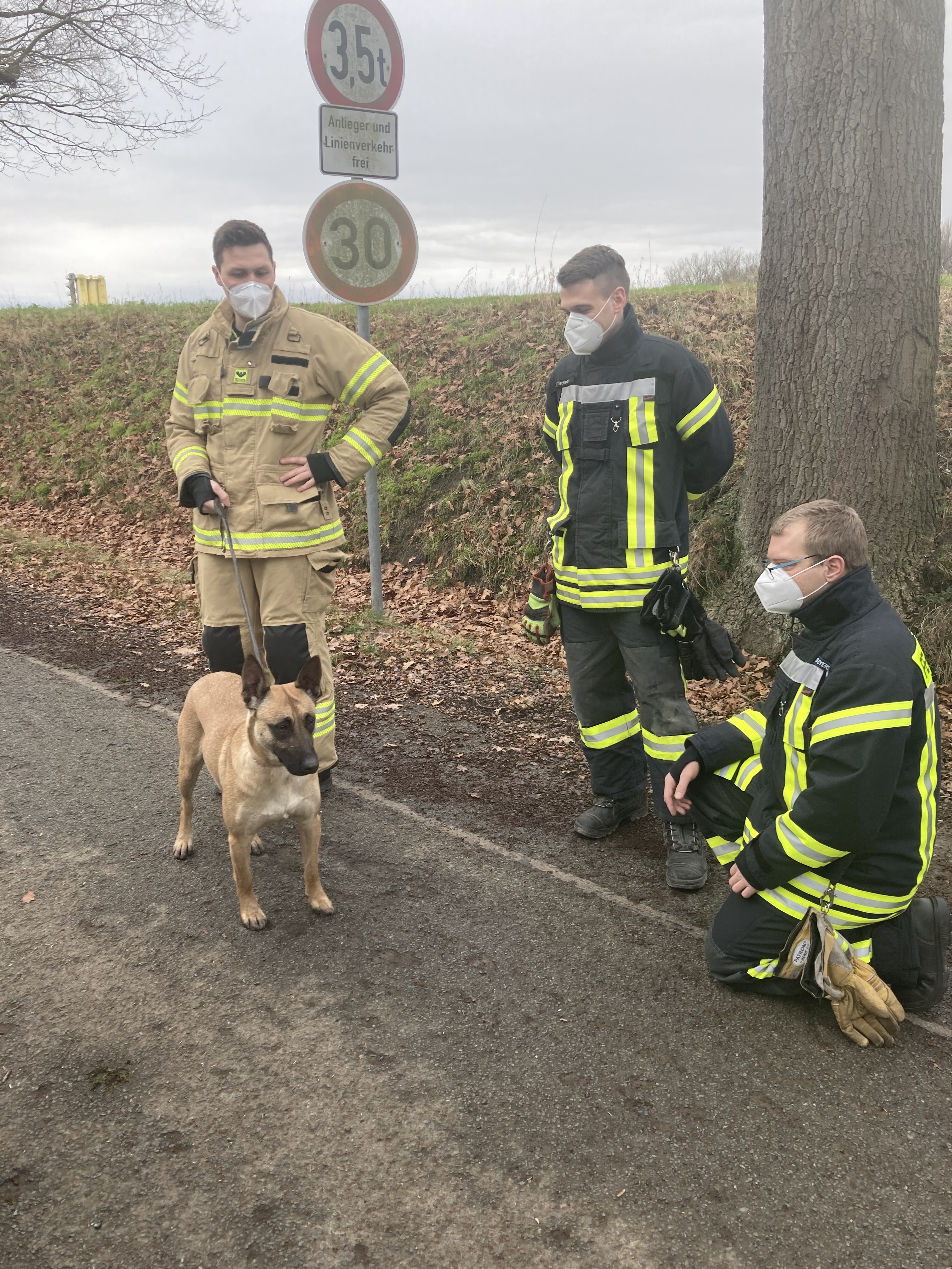 Durch die Besatzung der Drehleiter wurde ein herrenloser Hund auf der B239 gesichtet. Da auf der viel befahrenen Straße die Gefahr bestand, dass das Tier überfahren wird, wurde es von den Kollegen mit Hilfe eines Passanten eingefangen. Eine Nachbarin erkannte den Hund und konnte den Einsatzkräften erklären, wo der Besitzer wohnt. Mit dem Gerätewagen wurde er dann dorthin gebracht und dem Herrchen übergeben.