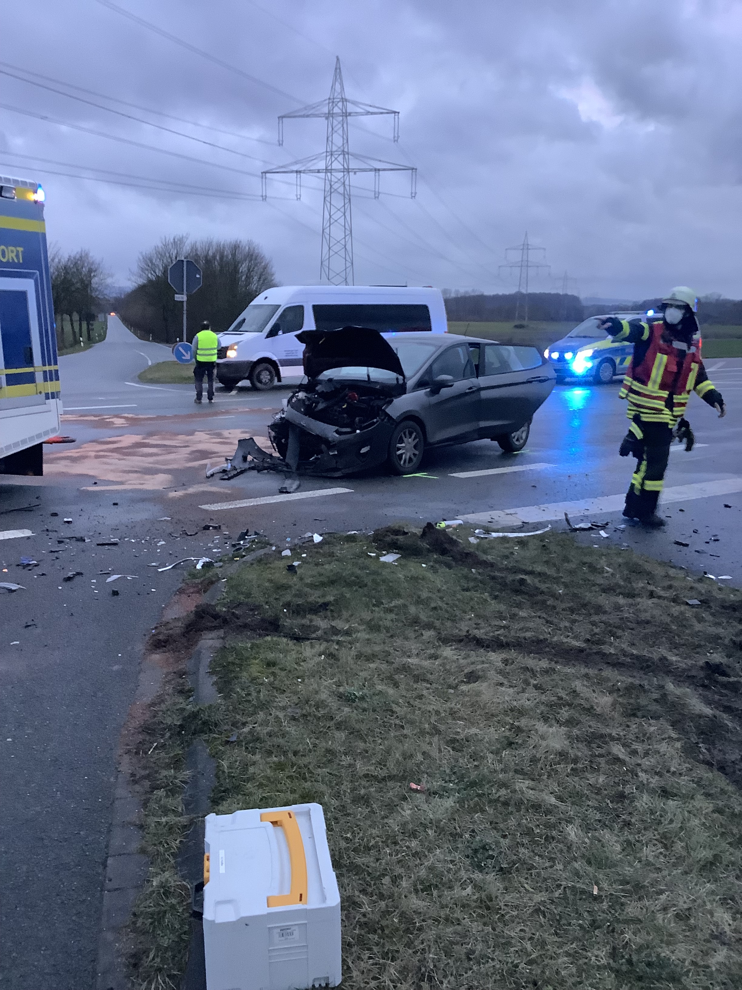 Auf der Ostwestfalenstraße ereignete sich an einem Kreuzungsbereich ein schwerer Verkehrsunfall. Ein Ford fuhr einem Renault in die Fahrzeugseite. Dabei verletzten sich die Insassen der beiden PKW schwer. Das HTLF 4000 der Feuerwehr Bad Salzuflen sicherten die beiden RTW und das NEF gegen den fließenden Verkehr ab. Da erhebliche Mengen an Betriebsmittel aus dem Ford Fiesta austraten und die Kreuzung verunreinigten, alarmierte der Fahrzeugführer des HTLF das HLF und den GW nach. Die Flüssigkeiten wurden mit Bindemittel abgestreut und von der Kehrmaschine des Bauhofes wieder aufgenommen. Die beiden PKW waren nicht mehr fahrbereit und mussten abgeschleppt werden. Abschließend wurde die Unfallstelle für die Polizei ausgeleuchtet, da diese Bildaufnahmen der Unfallsituation anfertigen musste.