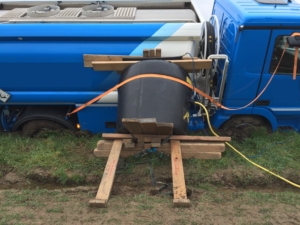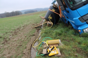 Zusätzlich zu den hauptamtlichen Kräften, ist die Maschinistenschleife des Löschzugs Schötmar/Werl-Aspe sowie die Löschgruppe Retzen alarmiert worden. Mit Hebekissen und einer Holzkonstruktion stützten die Einsatzkräfte den Tankwagen von der anderen Seite ab. Das weitere absinken und die Verschlimmerung der Schräglage konnten somit gestoppt werden. Ebenfalls baute die Löschgruppe Retzen zur Sicherheit einen Löschangriff auf und Ölbindemittel wurde bereitgestellt. Der Eigentümer des LKW bestellte einen weiteren Tankwagen an die Einsatzstelle, um die ca. 13000 Liter Heizöl umzupumpen. Anschließend gelang es mittels eines Krans den Tankwagen aus dem Schlamm zu heben und auf die Straße zu stellen. Der LKW blieb fahrbereit und es sind keine Flüssigkeiten ausgetreten. Die Straße „Kochheide“ war für die Dauer des Einsatzes komplett gesperrt. Erst gegen Mittag konnten alle Einsatzkräfte wieder einrücken.
