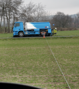 Gegen 6.45 Uhr wollte der Fahrer die Straße „Kochheide“ passieren, als ihm auf dem schmalen Weg ein PKW entgegenkam. Der LKW fuhr zu weit rechts, rutschte von der Straße ab und geriet auf der regengetränkten Bankette immer weiter in den Schlamm hinein. Da sein Wagen mit Heizöl gefüllt war, informierte er die Feuerwehr. Die Leitstelle Lippe alarmierte daraufhin die Feuerwehr Bad Salzuflen mit dem Alarmstichwort: „Technischen Hilfeleistung“. Vor Ort wurde die Einsatzstelle schnell aber genau erkundet und es musste sofort gehandelt werden. Um eine schnelle erste Sicherung herzustellen, wurde das HTLF4000 in Stellung gebracht und mittels Seilwinde wurde der Tankwagen gegen das weitere Abrutschen gesichert.