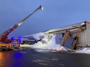 Zwei zeitgleiche Großeinsätze haben die Bad Salzufler Feuerwehr am Mittwochabend beschäftigt. Zunächst ging gegen 17.30 Uhr eine Brandmeldeanlage eines Industriebetriebs im Ortsteil Schötmar, bei der Leitstelle Lippe in Lemgo ein. Weitere Anrufer meldeten jedoch am gleichen Gebäude an der Daimlerstraße einen Hallendacheinsturz. Da zunächst nicht bekannt war, in welchem Ausmaß der Einsturz war und ob sich noch Menschen in der Firmenhalle befinden, wurde Großalarm ausgelöst. Kräfte aus dem Stadtgebiet und dem Kreis Lippe wurden zusammengezogen. Glücklicherweise bestätigte sich die erste Meldung nicht. Das 60×5 Meter große Schleppdach der Industriehalle hatte unter der Schneelast nachgegeben und zwei LKW-Sattelauflieger unter sich begraben. Menschen befanden sich glücklicherweise nicht unter den Trümmern. Die Erkundung im Inneren des Gebäudes stellten die Kräfte jedoch schnell ein: Auch das übrige Dach der Halle ist nach ersten Einschätzungen einsturzgefährdet.