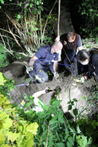 Zu einer Tierrettung ist die Bad Salzufler Feuerwehr am Freitagabend alarmiert worden. Im Ortsteil Biemsen-Ahmsen, an der Grenze zum Kreis Herford, hat sich ein Hund selbstständig gemacht und soll laut Anrufer am Rande einer Pferdekoppel in einen Fuchsbau gelaufen sein. Die Besitzer konnten das Tier in dem Bau noch hören. Nachdem ihre eigenen Versuche nicht gelangen, den Jack Russell Terrier aus seiner Lage zu befreien, alarmierten sie die Feuerwehr. Über ein Endoskop wurde zunächst versucht, das Tier in dem Bau zu entdecken. Aufgrund eines größeren unterirdischen Tunnelsystems gelang dieses jedoch nicht. Ein Minibagger bewegte vorsichtig Erde zur Seite, um die Gänge des Baus freizulegen. Der Hund machte über sein Bellen auf sich aufmerksam und wollte mutmaßlich schnell wieder aus dem Bau heraus. Nach rund drei Stunden konnte das Tier aus dem Fuchsbau befreit und zurück in die Arme seiner glücklichen Besitzer übergeben werden.