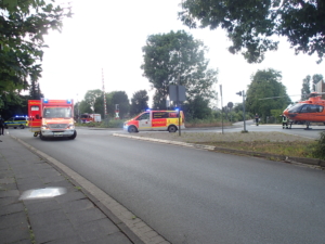 Im Bereich der Werler Straße, direkt am Bahnübergang, musste der Rettungsdienst eine mit dem Fahrrad gestützte Person behandeln. Aufgrund der schweren Verletzungen die sich der Radfahrer beim Sturz zugezogen hat, wurde durch den Notarzt ein Rettungshubschrauber für einen schnellen Transport in eine Spezialklinik angefordert. Für die Landung des Hubschraubers wurden ebenfalls das HLF20 und der Kommandodienst an die Einsatzstelle alarmiert. Durch die Einsatzkräfte wurde die Werler Straße weiträumig gesperrt und eine Sperrung der Bahnlinie angefordert. Der Rettungshubschrauber konnte somit auf einer Kreuzung in unmittelbarer Nähe des Rettungswagens landen, um somit einen unnötigen langen Transport bis zum Hubschrauber zu vermeiden. Die Feuerwehr unterstützte weiter bei der Umlagerung des Patienten in den Hubschrauber und sicherte den Start der Maschine ab. Nachdem die Straßewieder frei war, nahm die Feuerwehr und Polizei die komplette Sperrung zurück und gab den Bahnverkehr auf der Strecke wieder frei. Der Bereich am Bahnübergang war rund eine Stunde gesperrt.
