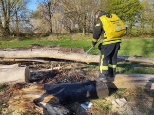 Gemeldet wurde ein brennender Baumstupf am Werreufer an der Meerbrede. Tatsächlich brannte ein Baumstamm und trockene Wiese auf ca. einem Meter länge. Die Flammen wurden mittels Waldbrandrucksack abgelöscht. Anschließend wurde der Baum links und rechts der Brandstelle zersägt, um auch die letzten Glutnester ablöschen zu können. Ursache war vermutlich unachtsam entsorgte Grillkohle.