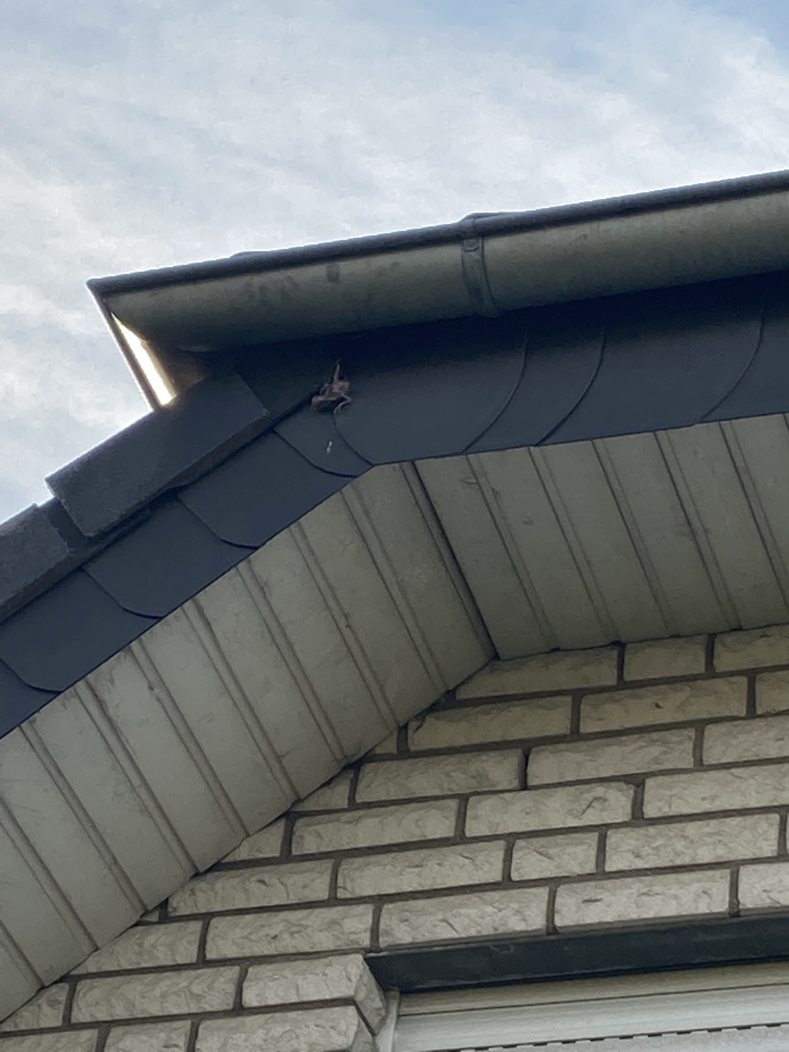 Ein Jungtier war wohl vermutlich aus dem Nest gekullert und hatte sich dabei mit dem Bein in einen Dachstein unterhalb der Dachrinne verfangen.