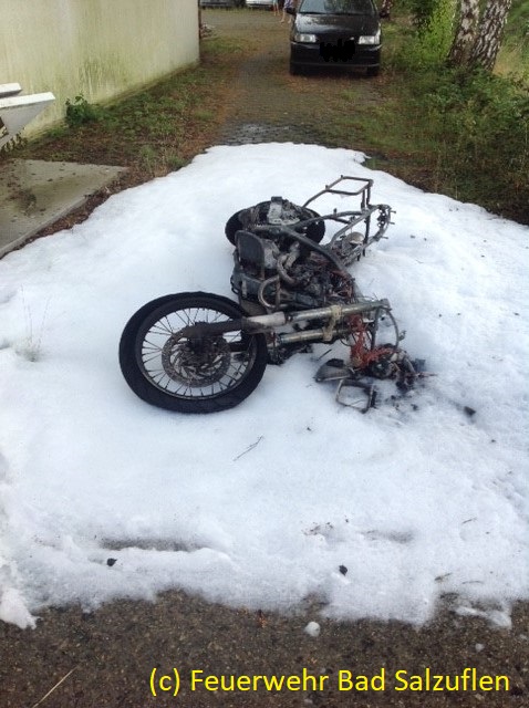 Eine Sonntagsausfahrt ist für einen Motorradfahrer anders verlaufen, als gedacht. Kurz nachdem er aufgebrochen ist, stellte er eine Störung an seinem Krad fest. Da er gerade in der Nähe seiner Werkstatt war, wollte er die Maschine dort abstellen, um sie am Montag überprüfen lassen. Doch dann kam es alles ganz anders. Noch während er das Zweirad parkte, fing das Motorrad Feuer. Ihm blieb nur noch abzuspringen und die Feuerwehr zu alarmieren. Bis zum Eintreffen der Einsatzkräfte konnte er nur mit ansehen, wie seine BMW F 650 in Rauch und Flammen aufging. Die Einsatzkräfte löschten das Wrack ab und schützten die Umgebung vor der immensen Wärmestrahlung. Glücklicher weise passierte dem Fahrer nichts, doch sein frisch „renoviertes“ Zweirad erlitt einen Totalschaden.