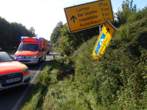 Der erste Einsatz des Tages war ein Verkehrsunfall mit eingeklemmter Person im Ortsteil Lockhausen. Ein PKW fuhr zu weit in die Fahrbahnmitte und streifte einen entgegenkommenden PKW. Dieser geriet anschließend außer Kontrolle, schleuderte gegen ein Verkehrsschild und kam schließlich im Straßengraben zum stehen. Die Fahrerin wurde verletzt und in ihrem Fahrzeug eingeklemmt. Vorbildliche Ersthelfer kümmerten sich sofort um die Patientin und setzten den Notruf ab. Der Unfallverursacher wurde nicht verletzt.