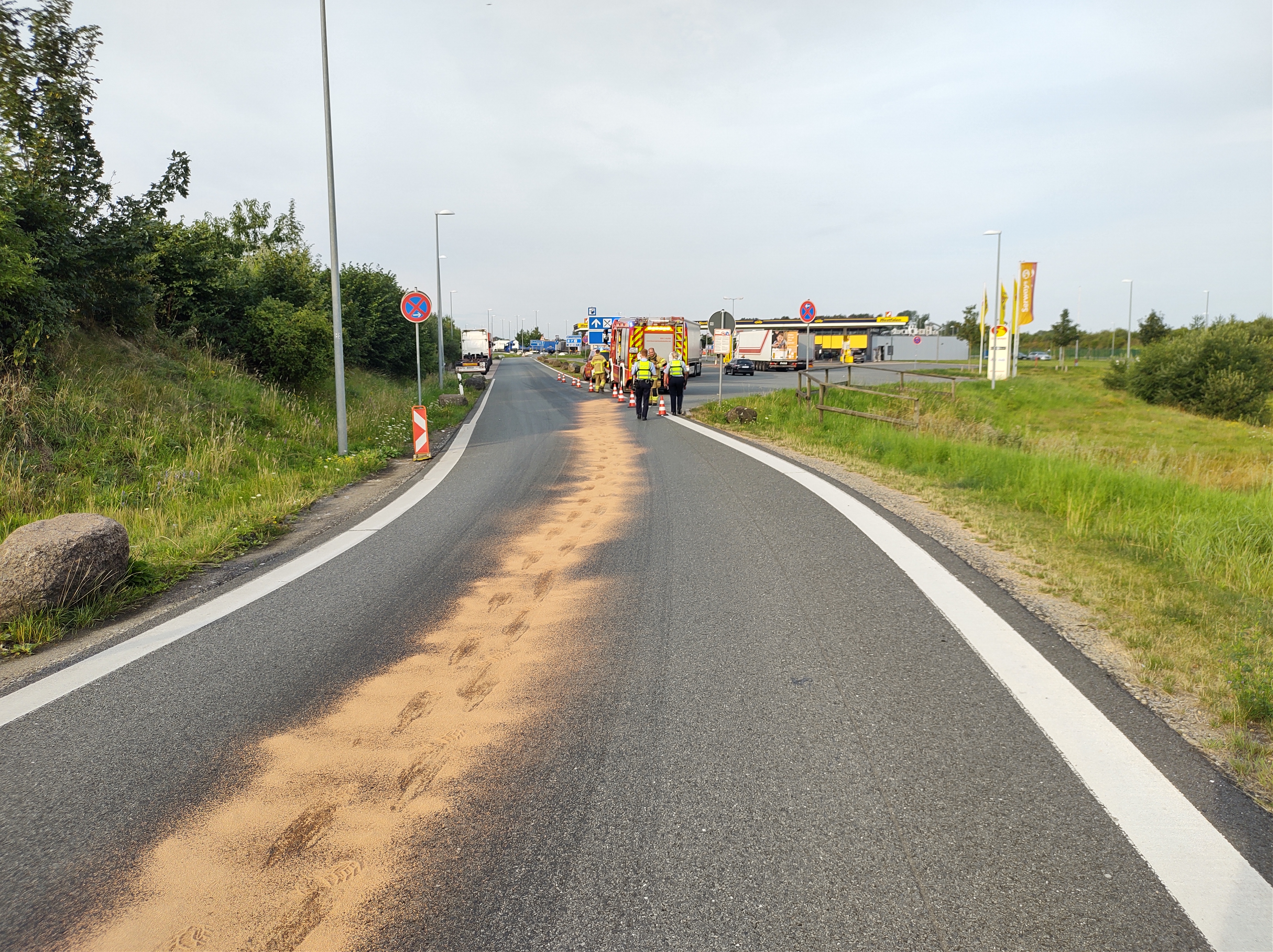 Ein LKW hatte auf der BAB 2, kurz vor der Raststätte Lipperland Nord, einen Reifenplatzer. Ein nachfolgender LKW konnte nicht mehr ausweichen und fuhr über die Trümmerteile. Dabei beschädigte er sich das Getriebe und verlor auf einer Strecke von ca. 400m auf der Autobahn Getriebeöl. Er lenkte seinen Sattelzug daraufhin auf die Raststätte und blieb dort liegen. Zusammen mit der Autobahnpolizei wurden zwei Fahrstreifen und die Auffahrt zur Raststätte gesperrt. Die Einsatzkräfte streuten zunächst den betroffenen Bereichab. Ein Spezialunternehmen wird im Laufe des Vormittags die Fahrbahn noch intensiv reinigen.