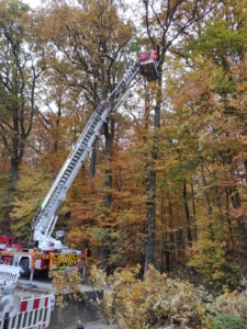 Die städtischen Forstmitarbeiter, haben im Bereich des Forsthausweg Fäll- und Aufräumarbeiten durchgeführt. Hierbei wurde ein Problembaum durch den Förster entdeckt. Der Baum mit einer Höhe von über 20m, stellte sich als sehr kritisch dar und musste sofort von oben abgetragen werden. Hierfür wurde die Feuerwehr durch den Förster zur Hilfe gerufen, um einen zeitlichen Verlust zu minimieren. Die Löschgruppe Bad Salzuflen hat diese Aufgabe unter der Leitung des Kommandodienst übernommen und mit Hilfe des in der Löschgruppe stationierten Teleskop-Gelenkmast die Abtragung durchgeführt. Ein Mitarbeiter vom Forst hat das Abtragen aus dem Korb mit einer Kettensäge übernommen, während die Feuerwehr das bedienen vom Teleskop-Gelenkmast übernahm. Ebenfalls wurde der Bereich während der Arbeiten großräumig abgesperrt. Nach der Beendigung dieser Maßnahmen, konnte die Feuerwehr wieder einrücken und den Einsatz beenden.