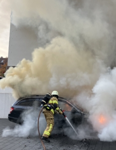 Am späten Nachmittag ist die Feuerwehr zu einem PKW-Brand, in die Bismarckstraße, alarmiert worden. Bereits bei Eintreffen der Einsatzkräfte brannte der Motorraum in voller Ausdehnung. Auch in die Fahrgastzelle konnte sich das Feuer ausbreiten. Mit zwei C-Rohren wurde eine schnelle Brandbekämpfung eingeleitet. Ein Gebäude wurde kurzeitig von der Rauchentwicklung eingehüllt, allerdings ohne eine Beeinträchtigung. Eine angrenzende Styropordämmung konnte den Temperaturen nicht standhalten und schmolz hinter dem Sichtputz. Die Feuerwehr öffnete sicherheitshalber den Hohlraum und kühlte die Styroporreste ab. An dem Fahrzeug entstand ein wirtschaftlicher Totalschaden. Verletzt wurde aber niemand.