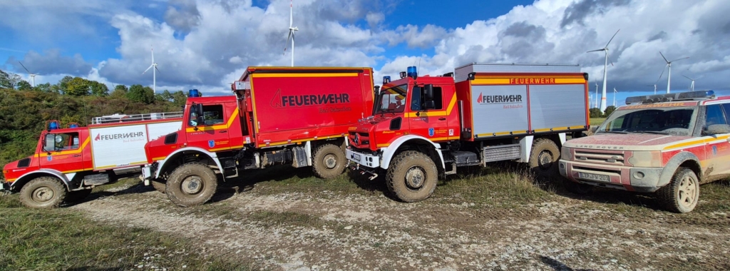 Feuerwehrfahrzeuge mit Unimog-Fahrgestellen und den Geländewagen Landrover unter