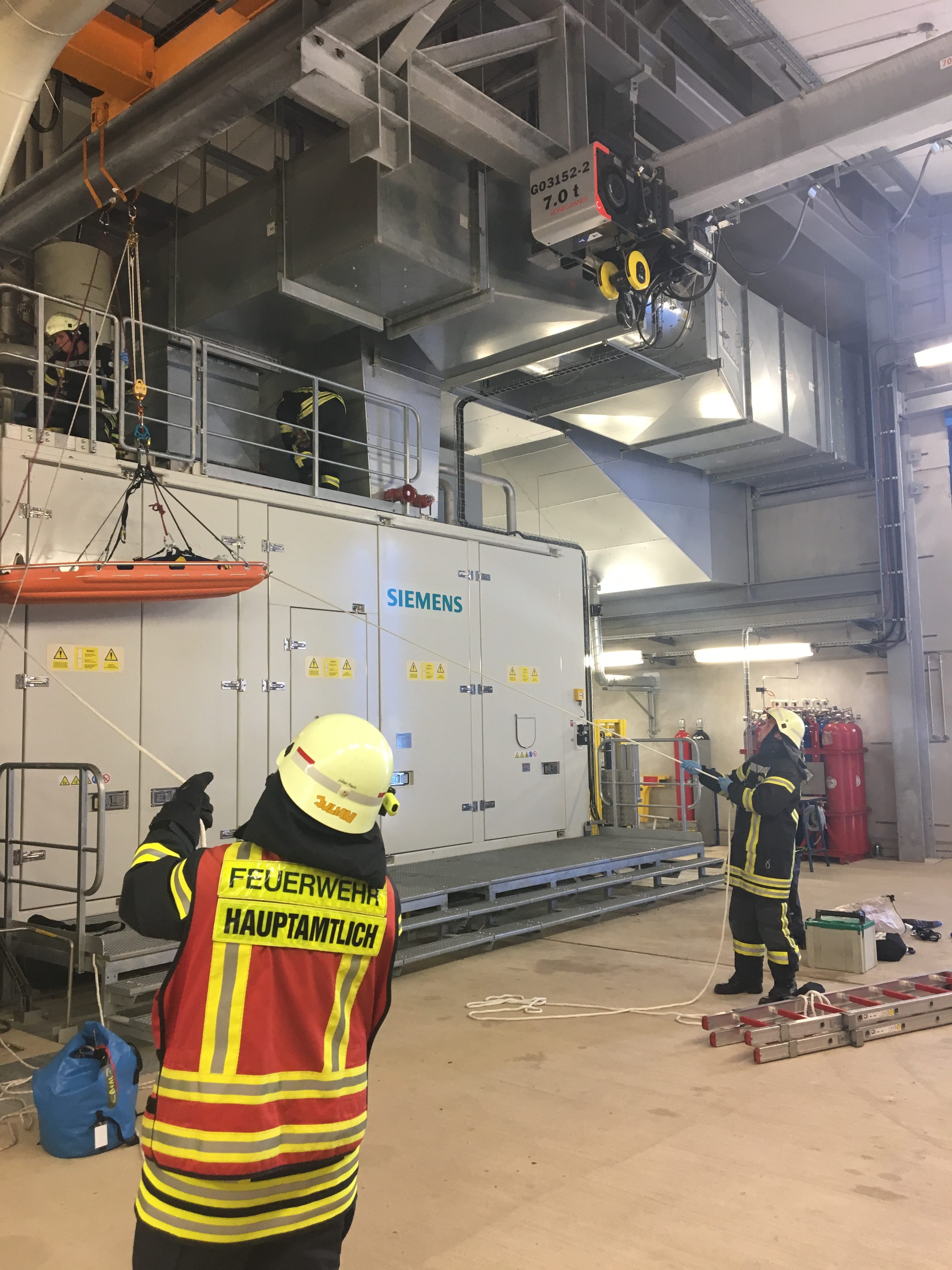 Zu einem nicht alltäglichen Einsatz wurde die hauptamtliche Wache unter dem Stichwort „TH 1“ zu einer Personenrettung in 4m Höhe alarmiert. In einem Industriebetrieb hatte ein Mitarbeiter auf einer 4m hohen Plattform einen Herzinfarkt erlitten und war nicht mehr in der Lage, diese selbstständig zu verlassen. Zunächst musste eine Möglichkeit gefunden werden, den Patienten sicher runter zu transportieren. Die Platzverhältnisse waren sehr beengt und Rohre, Kabel und Geländer waren ebenfalls im Weg.Hier kam nur die Rettung mittels Abseilen mit der Schleifkorbtrage in Frage. Nachdem der richtige Festpunkt gefunden und alle Sicherungsseile befestigt waren, konnte der Patient sicher abgelassen werden. Wärend der gesamten Rettungsmaßnahmen wurde der Patient durch die hauptamtlichen Kräfte rettungsdienstlich versorgt.