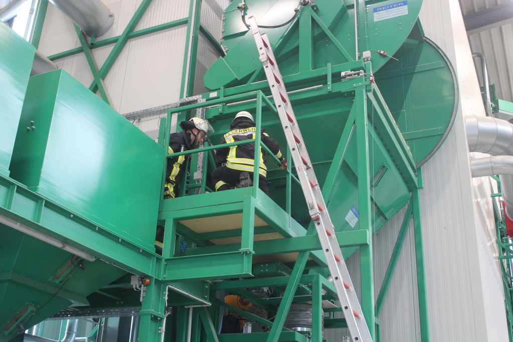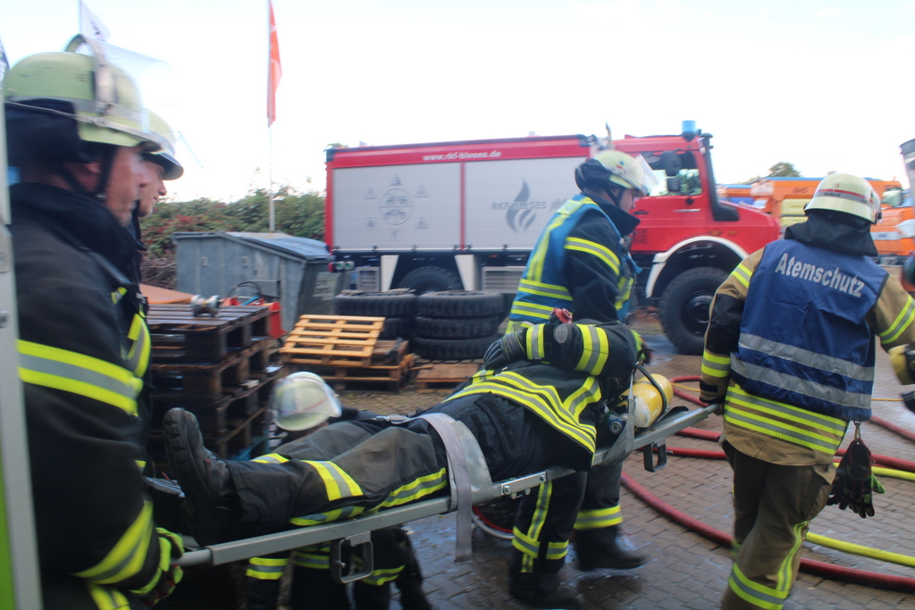 Zur Brandbekämpfung sind die Einheiten nach Bielefeld-Altenhagen in die Werkstatt der Firma RKF Blesse alarmiert worden. Ein Innenangriff war erforderlich. Da die Verrauchung in dem Firmengebäude nicht real durchgeführt werden konnte, nutzten die Bielefelder Übungsleiter eine Art Milchglasfolie, die den Trupps auf den Atemschutzmasken installiert wurde und nahezu keine Sicht ermöglichte. Eine besonders anspruchsvolle Aufgabe, die sich im Verlauf der Übung als weiterhin komplex darstellte. Während der Brandbekämpfung verletzt sich der Angriffstruppführer. Die Lage eskaliert, als der Mayday-Funkspruch durch die Funkgeräte schallt. Die Anspannung steigt. Der Sicherheitstrupp geht vor und kann den bewusstlosen Kameraden aus den vermeintlichen Flammen ziehen. Ein Szenario mit unvorhergesehener Entwicklung, die alle Einheiten auf die Probe stellte.