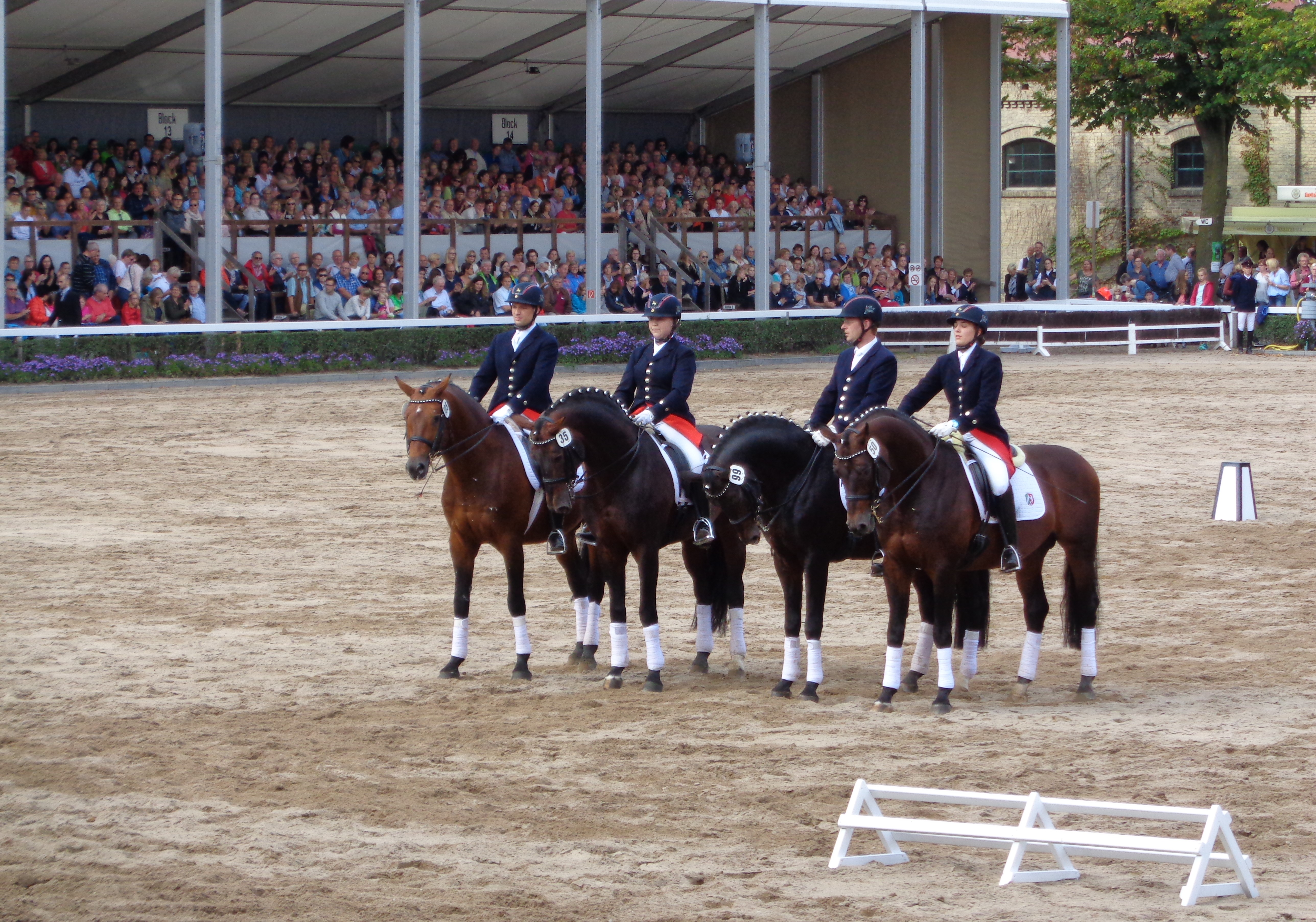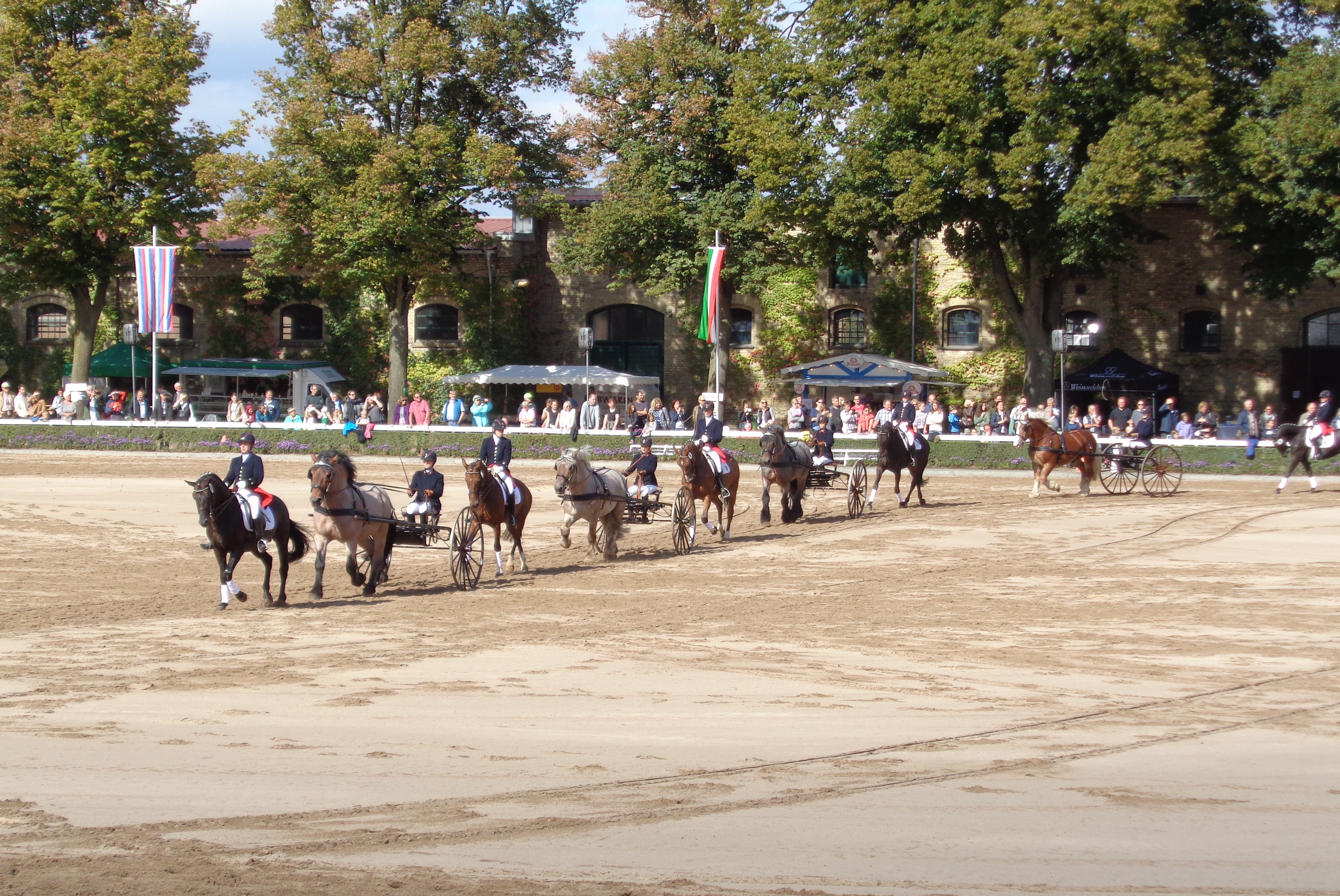 Um 14.00 Uhr ging’s los. Drei große Tribünen waren restlos gefüllt. Gut, daß wir feste Plätze vorbestellt hatten. Auf der riesigen Sandarena sahen wir eine großartige Vorführung, herrliche Reitpferde, Kaltblüter, Zwei-, Vier- und Sechsspänner, Postkutschen, Sulkys und ein Wagenrennen wie zu alten Zeiten. In der Pause haben wir das Gelände erkundet und uns erneut gestärkt. Nach 3 ½ Stunden endete die Pferdeschau mit einem fulminanten Finale.