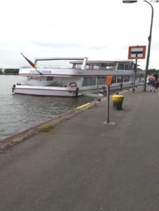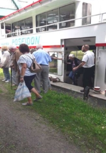 Nach kurzer Wartezeit legte unser „Dampfer“ an und wir gingen an Bord. Bei idealem Wetter genossen wir eine ca. zweistündige Fahrt auf dem Kanal. Leider konnten wir die neue Schleuse noch nicht befahren, weil sich die Fertigstellung um vier Monate bis zum August verzögert. So hat eben jede Region in Deutschland seinen Flughafen oder seine Staatsoper. Es gab an Bord für Jeden die Möglichkeit, in Ruhe eine Tasse Kaffee mit Kuchen oder ein Kaltgetränk zu verzehren, was auch gerne in Anspruch genommen wurde. Dann hielt die „Poseidon“ auf freier Strecke unter einer Brücke und wir durften eine Böschung zur Straße hoch gehen um unser nächstes Ziel anzusteuern. |