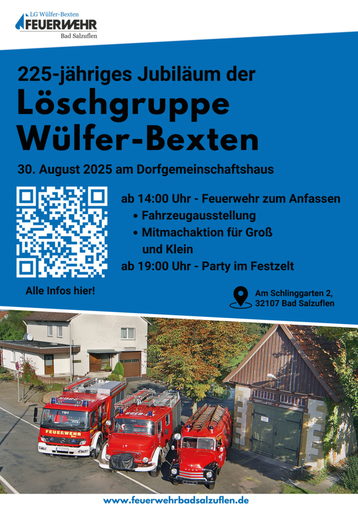 Der Countdown läuft! Am Samstag, den 30. August 2025, veranstaltet die Löschgruppe Wülfer-Bexten ein Fest anlässlich ihres 225-jährigen Bestehens. Spannung, Action und echte Feuerwehrmomente erwarten euch bei uns. Seid gespannt auf ein Ereignis, das ihr nicht verpassen wollt!