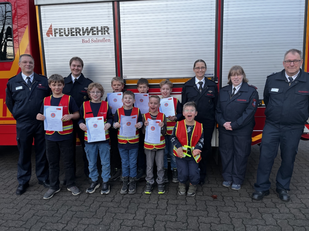 Zum zweiten Mal in ihrer noch jungen Geschichte hat die Kinderfeuerwehr Bad Salzuflen die Kinderflamme verliehen. Am Standort der Gruppe 2, dem Gerätehaus der Löschgruppe Bad Salzuflen, bekamen zehn Nachwuchsbrandbekämpfer die höchste Auszeichnung ihrer Alterspanne verliehen. Feuerwehrchef Ralf Mensenkamp lobte ihren Einsatz: „Ihr habt viel für die Prüfung getan und wenn ich das Strahlen in den Augen sehe, hat sich der Einsatz gelohnt“, sagte der Stadtbrandinspektor. Jonas Möller, Thiago Minich, Ela Nur Sen, Fabian Gabelt, Ilia Ivankovic und Thilo Pick erhielten die Kinderflamme in Bronze. Hierfür mussten sie unter anderem einen gespielten Notruf absetzen, die Aufgaben der Feuerwehr benennen, eine Personensuche in einem abgedunkelten Raum durchführen oder auch ihre Kreativität unter Beweis stellen. All diese Prüfungen absolvierten die Teilnehmer mit Bravour.