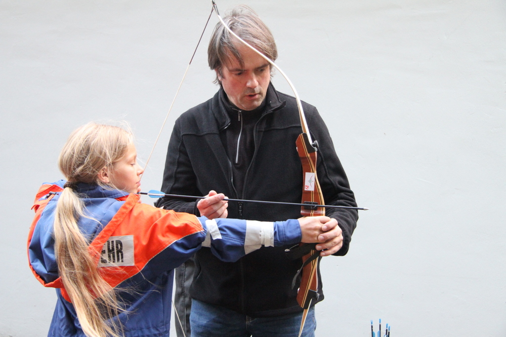 Auf dem Schießstand selbst wurden die Kinder und ihre Betreuer von Christian, Ricarda und Andreas von der Bogenabteilung begrüßt. Nach einer kurzen Einweisung ging es auch schon los: Mit dem Blick durch eine Lochscheibe wurde festgelegt, ob ein Rechts- oder ein Linkshänderbogen nötig ist. Bevor es an die „echten“ ging, wurde an Plastikbögen trainiert. Ricarda erklärte den Besuchern das richtige ziehen der Bogensehne. Der Spaß stand auch hier im Vordergrund, bevor es dann wirklich ernst wurde: An speziellen Kinderbögen durfte die Jugendfeuerwehr das erste mal anlegen. Christian von der Bogenabteilung achtete dabei genaustens darauf, dass die korrekte Haltung auch eingehalten wurde, um Verletzungen vorzubeugen.