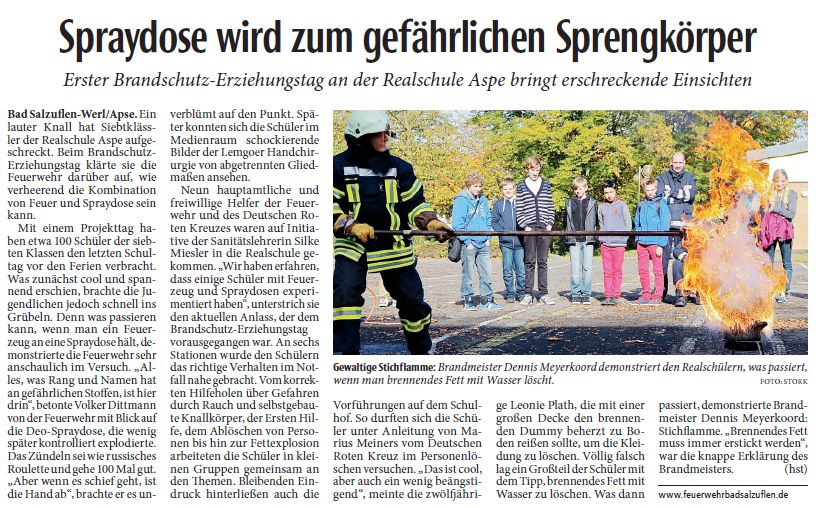 Am heutige Freitag, den letzten Freitag vor den Herbstferien, fand ein Projekttag unter anderem mit der Feuerwehr und anderen Helfern an der Realschule Werl-Aspe statt. Die Schülerinnen und Schüler durchliefen insgesamt sechs Stationen mit unterschiedlichen Themen. An den drei theoretischen Stationen in den Klassen- bzw. Medienräumen wurden Themen wie „Wie gefährlich ist Brandrauch – Richtiges Verhalten im Brandfall“, „Der Unsachgemäße Umgang mit Feuerwerkskörpern“ und „Wie setze ich einen Notruf richtig ab – was passiert bei Spaßanrufen bei der Feuerwehr?“, behandelt. An den Außenstationen auf dem Schulhof konnten die Schülerinnen und Schüler eine brennende Person mit Hilfe einer Löschdecke ablöschen, ihnen wurde vorgeführt was passiert wenn man brennendes Fett mit Wasser löscht, der Zerknall einer Deospraydose wurde vorgeführt und parallel dazu wurde den SchülerInnen praktisch gezeigt wie man kleinere Wunden richtig versorgt. Unterstützt wurde die Feuerwehr dabei zum einen von einem Mitarbeiter vom VüK Lage (Spraydosenzerknall) sowie vom DRK Leopoldshöhe mit deren RTW (Ablöschen von Personen und Versorgung kleinerer Wunden). Weiterhin wurden anonym reale Bilder von der Handchirurgie Lemgo zu Verfügung gestellt. Diese haben eindrucksvoll einen unsachgemäßen Umgang mit Feuerwerkskörpern veranschaulicht. Erfahrungsberichte von betroffenen Personen schilderten die Folgen die ein solcher Unfall mit sich bringt, besonders die Folgen auf das Berufsleben. Nach Ende der sechsten Schulstunde wurden die SchülerInnen in die Ferien entlassen.