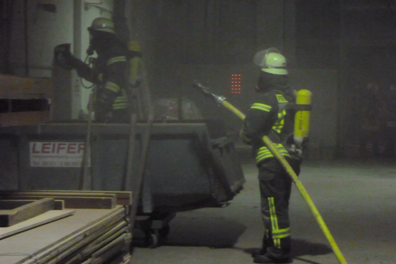 Die erste Maßnahme der Feuerwehr bestand darin, einen Schaumteppich auf die oberste Späneschicht aufzutragen. Dies geschah über eine Zugangsklappe oberhalb des Bunkers. Der Schaum sollte eine Sauerstoffzufuhr unterbinden und aufwirbelnden Staub binden. Im unteren Bereich des Bunkers wurde eine Tür unter gebührender Vorsicht geöffnet, um an die Holzspäne zu gelangen. Von der Zugangsöffnung des Bunkers wurden die Späne zuerst von Hand mit Schaufeln abgetragen, bis später ein Teleskopradlader zur Verfügung stand, der diese dann abtrug und abtransportierte.