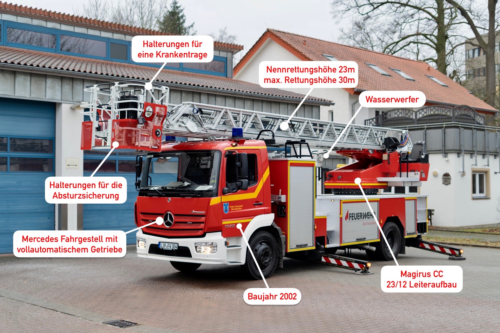 Der Brandschutzbedarfsplan erfordert die Vorhaltung eines zweites Hubrettungsgerätes in der Stadt, deswegen entschied man sich aus Kostengründen eine generalüberholte Drehleiter anzuschaffen. Die aus dem Jahr 2002 stammende Drehleiter ist zuvor einige Jahre bei der Feuerwehr in Viersen im Einsatz gewesen. Nach einer Grunderneuerung steht sie nun bei der Löschgruppe Bad Salzuflen im Gerätehaus an der Riestestraße. „Im Zuge unseres Fahrzeugkonzepts werden wir in einigen Jahren mit der Neubeschaffung der Drehleiter für die hauptamtliche Wache das derzeit stationierte Hubrettungsgerät weiter an die Löschgruppe Bad Salzuflen verlegen“, erklärt Mensenkamp.