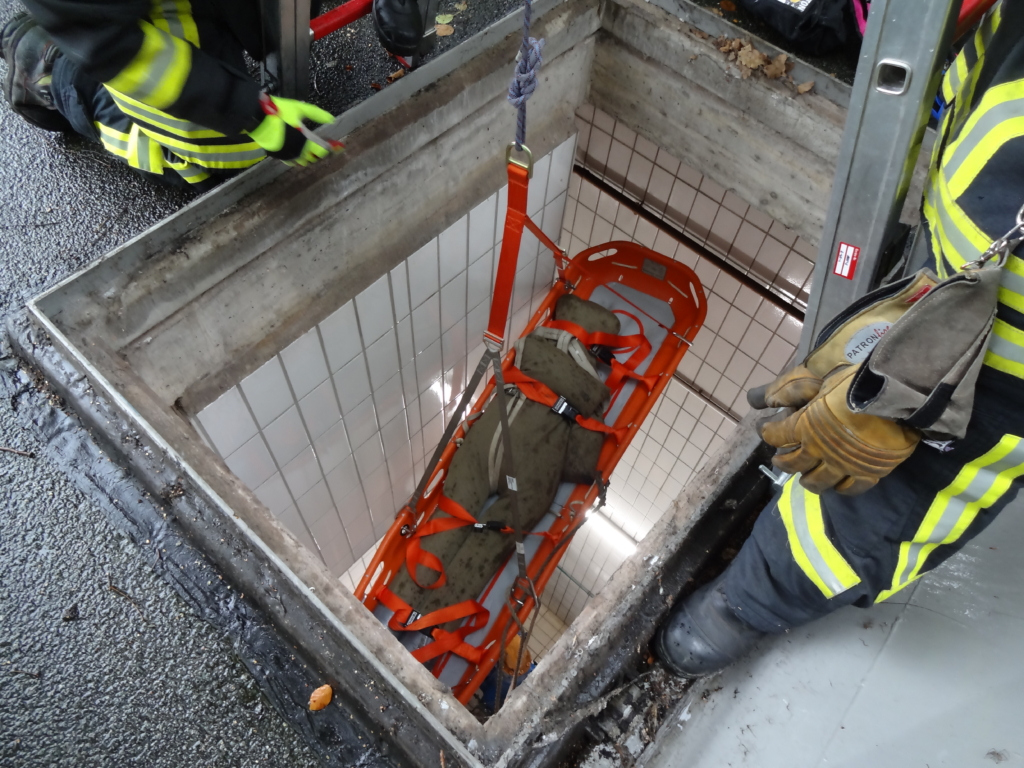 Am heutigen Mittwoch wurde die Feuerwehr zu einem ausgelösten Personenmelder der Kläwerke alarmiert. Der Personenmelder wird von den Bediensteten des Klärwerkes am Körper getragen. Im Falle eines Unfalls läuft ein Alarm beim Betreiber dieser Geräte auf. Diese wiederum alarmieren die Feuerwehr und den Rettungsdienst. Bei dieser Übung sollte festgestellt werden, wie genau es möglich ist den ausgelösten Melder per GPS zu orten, da sich der vermeintlich Verunfallte in einem 10m tiefen Schacht befand. Die verunfallte Person, in diesem Fall ein Dummy, wurde von der Feuerwehr mit Hilfe der Schleifkorbtrage und einer Bockleiter aus dem Schacht gerettet. Bei dieser Übung konnten erstaunliche Erkenntnisse gewonnen werden. Einen herzlichen Dank an die Kollegen der Abwasserbetriebe.