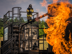In unterschiedlichen Übungen mussten u.a. auch mit einem C-Hohlstrahlrohr die Flammen an einem Übungsgerät, unter Anleitung des Trainers, kontrolliert weg von einem Abschieber gelenkt werden, damit der Abschieber von Hand zugedreht werden konnte. Das Team am Strahlrohr musste in diesem Fall sehr konzentriert handeln, da jede kleinste Bewegung am Strahlrohr in ca. 2m Entfernung zur brennenden Austrittsstelle ein ständiges Ändern des Flammenbildes zur Folge hätte. Zum Einsatz kamen auch unterschiedliche Kombinationen von Löschmitteln (Pulver und Wasser oder Schaum) um ein vollständiges Ablöschen von Flüssigkeitsbränden nach durchgeführter Menschenrettung zu ermöglichen.